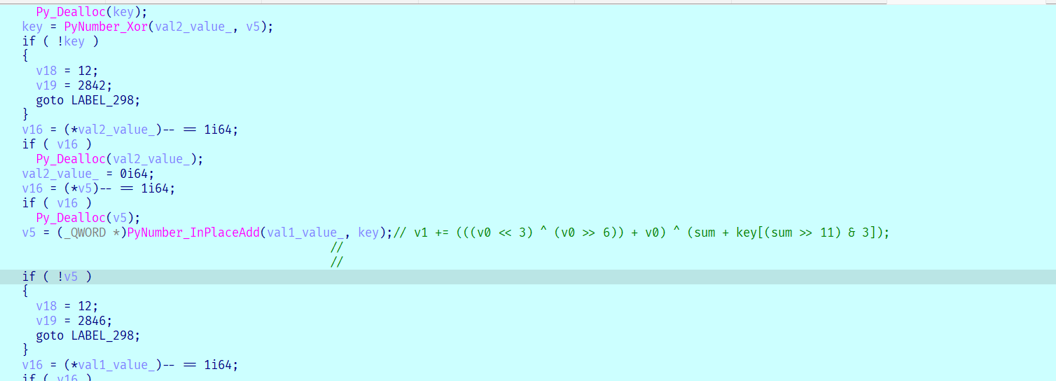 v0 -= (((v1 << 3) ^ (v1 >> 6)) + v1) ^ (sum + key[sum & 3]);